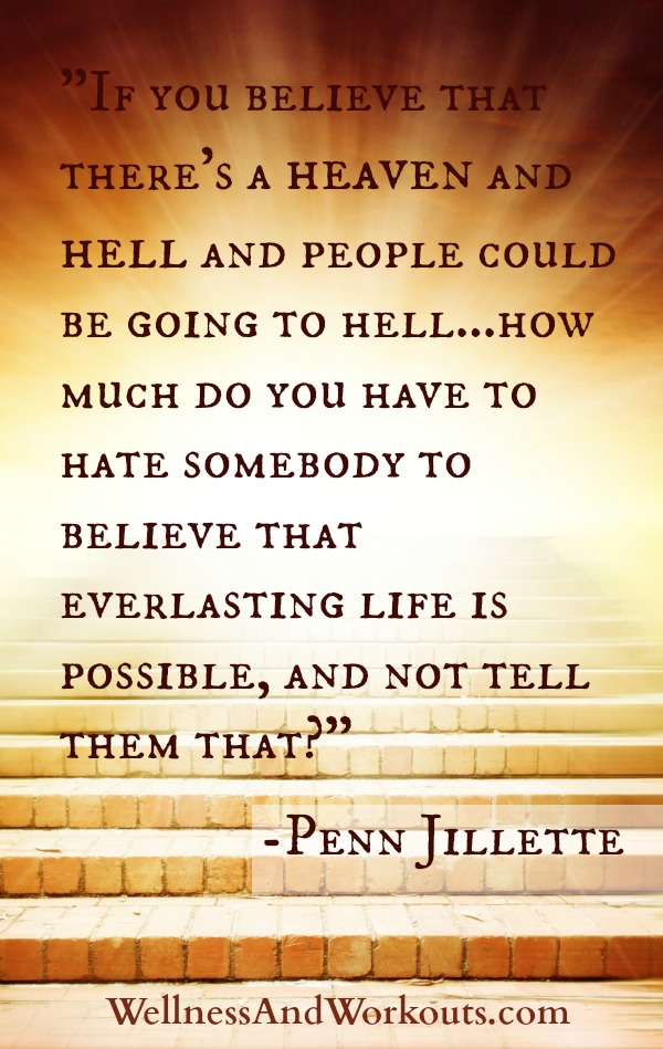 “If you believe that there’s a heaven and hell and people could be going to hell—or not getting eternal life or whatever—and you think that, well, it’s not really worth telling them this because it would make it socially awkward... How much do you have to hate somebody to not proselytize? How much do you have to hate somebody to believe that everlasting life is possible and not tell them that?” -Penn Jillette